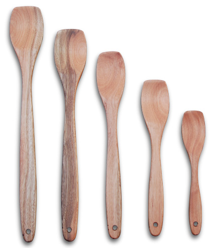 Set de 5 cucharas de diferentes medidas: 31 cm, 39 cm, 47 cm, 53 cm y 60 cm, que te permite que tengas una cuchara a la medida de lo que elijas cocinar., con ango con orificio para poder colgar. Construidas en madera Saligna, ideal para cocinar con disco de arado o paellera.