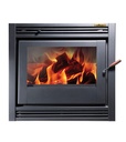 Características: Es un equipo de alto rendimiento y doble combustión, gracias a esto, optimiza el uso de leña y entrega un 80% más de calor que un hogar abierto. Cuenta con visor vitrocerámico que permite la experiencia de ver el fuego, además de cierre hermético para no liberar olores ni humo al ambiente.